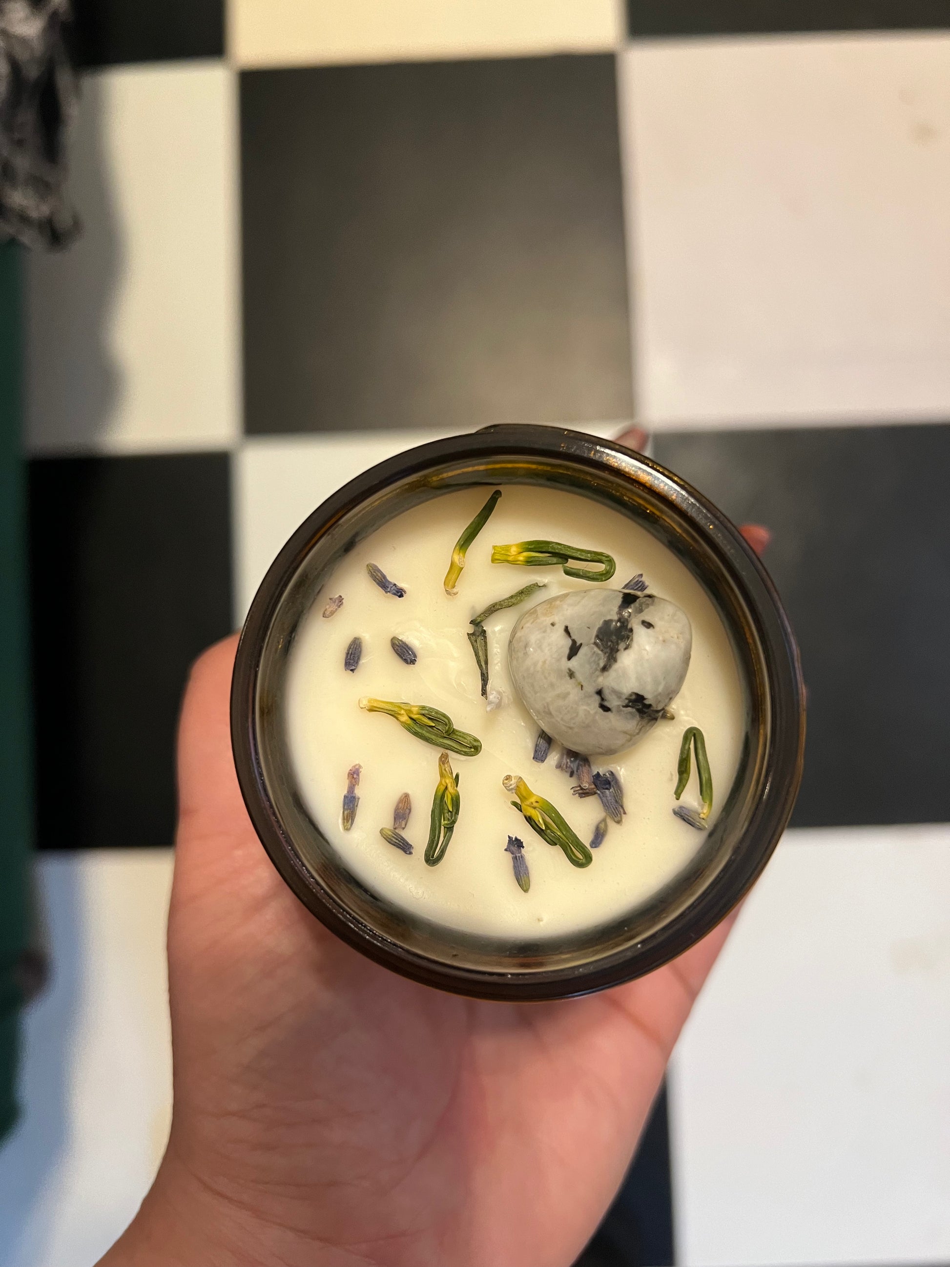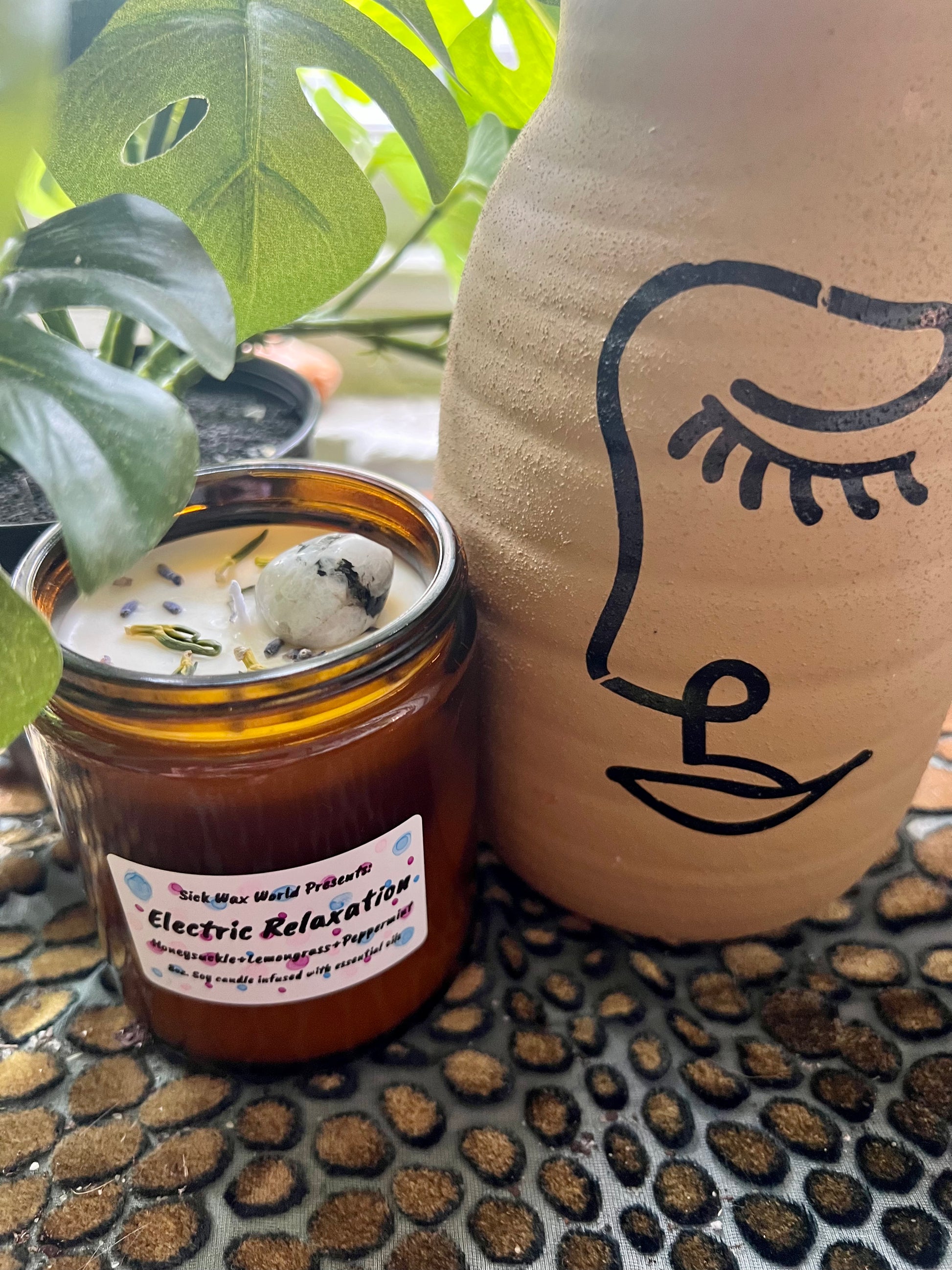 Electric Relaxation is topped with lavender buds, honeysuckle, and a moonstone gem. Moonstone inspires self joy and appreciation, inner peace and harmony,helps with grounding and promotes optimism. Step into your own, you’re ready.